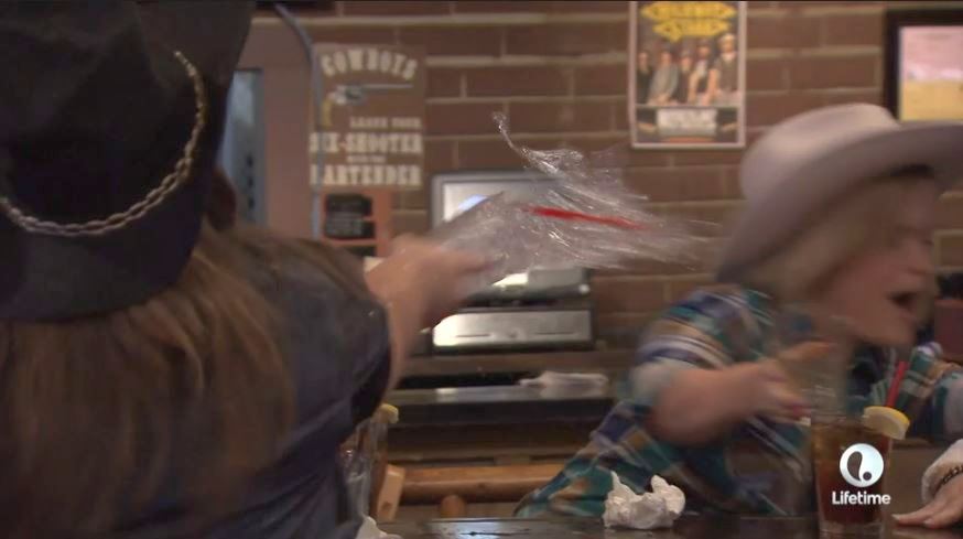 And thus begins the following sequence: Terra tosses a drink in Christy’s face, Christy tosses a drink in Terra’s face, Christy throws her glass at Terra (two glasses in a row, it appears), and finally, Terra throws her glass at Christy – which hits her right in her cowboy hat. The rest is lawsuit history.