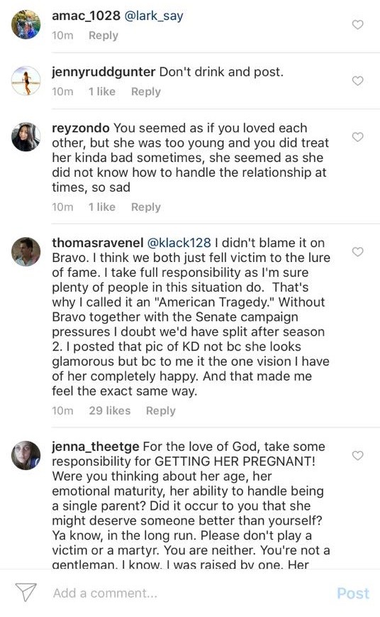 Thomas wrote back to one Instagram user saying, “I didn’t blame it on Bravo. I think we both just fell victim to the lure of fame. I take full responsibility as I’m sure plenty of people in this situation do. That’s why I called it an ‘American Tragedy.'” I don’t feel like this is an “American Tragedy,” since most of us aren’t on reality TV, but at the very least he took responsibility for getting caught up with fame himself….after the initial post, but still.