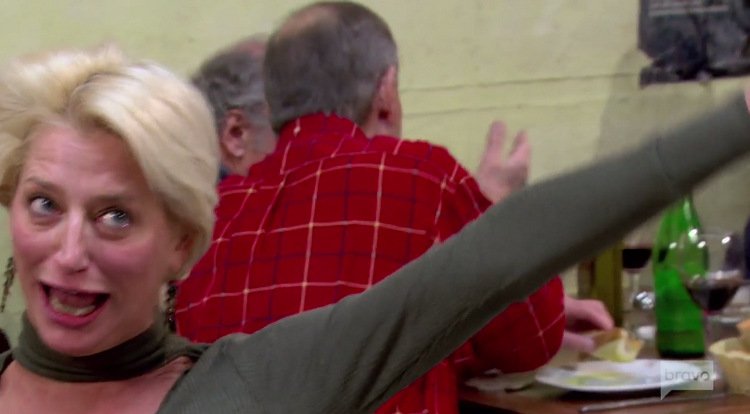 We begin with Bethenny Frankel arriving at an Italian restaurant in the Bronx, where hopefully there’s a revolver duct taped to the toilet just in case. She wants the ladies (sans Ramona Singer) to get out of the city and experience carbs. Luann D’Agostino (are we officially calling her that now?), Carole Radziwill, Sonja, Dorinda, and Tinsley show up to take part in this social experiment. Because she’s always down for the cause, Dorinda even shows up already half in the bag.