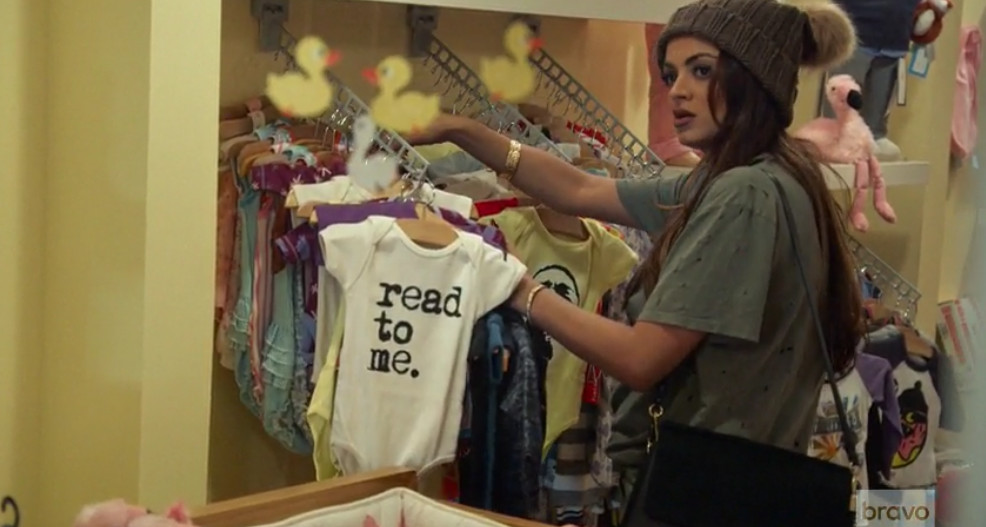 Golnesa “GG” Gharachedaghi shows up at a baby boutique to shop for Asa’s miracle and announces to the store owner that she is shopping for a friend who has a little penis growing inside of her. The owner fakes a laugh, pretending that this is a normal way for someone to request to see baby boy clothes, and shoves GG towards the back of the store where her filthy mouth can’t soil any new customers coming in. All this baby stuff is naturally giving GG baby fever and given that she’s been in a relationship for a whole two months, why wouldn’t she have babies on the brain? Shervin shows up to take up space help and amid the baby onesies and adorable little shoes, GG takes a call on speaker from her doctor’s office, who is letting her know that since she discontinued her RA meds a few weeks ago, she can start trying to get pregnant in two months’ time. GG gets off the phone and breathlessly relays to Shervin that she could be shopping here for herself in a few short months, while Shervin tries to mask his horror at the fact that she has only been dating this guy for two months and is already going off her meds so she can try and get pregnant with him. But just as quickly as that crazy train left the station, another one arrives and GG changes the subject to MJ telling everyone that Shervin has been swinging his ding-a-ling in people’s vagina’s other than his girlfriend’s. Ugh, why does GG talk like she’s an 8 year old on the playground? What grown person calls a man’s penis a ding-a-ling? *Remembers all of Shahs cast has used that term* Okay, never mind. Shervin immediately denies it all, saying there is no truth to that rumor and GG says she believes him. Too bad that will last about as long as her relationship with Shalom.