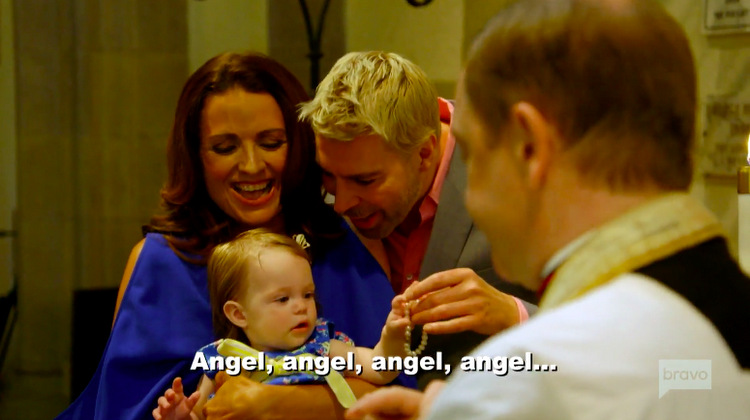 But it’s straight to the ugly cry for me, because these damn Bravo editors are KILLING me with their flashback montage of Jeff and Gage’s IVF and surrogacy story, paired with the group reciting Father Davies’ verses. Oh lord, I need a hankie – or a bath towel!!! These guys waited a long time to get to this moment, and I’m really, truly happy for them. <sniff>