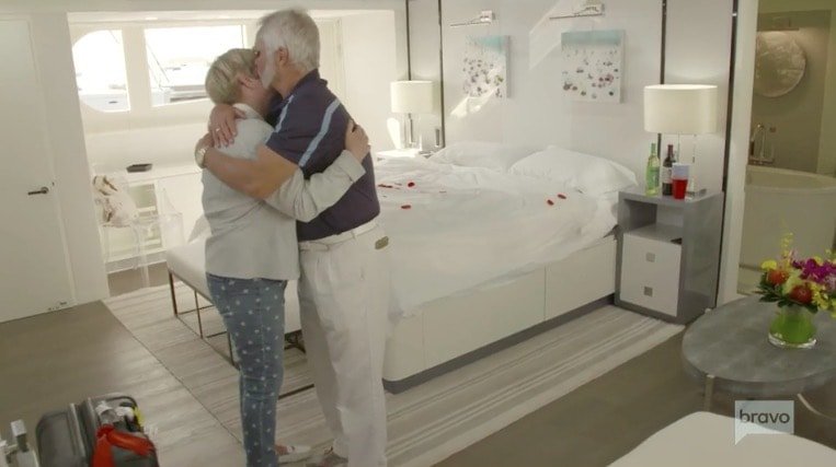 I actually think these guests are fun (other than praising Jesus for booze every 5 minutes). Unfortunately their good vibes have not extended to Jen. While prepping dinner she’s trying to chill champagne by spinning it in the insta-bucket. Kate jokingly asks Jen if she was popular in high school, and Jen retorts that she hasn’t been whoring around as long as Kate has. Snippily, Kate wonders, “How old’s your daughter.” This sets Jen all the way off. She was MAAARRIED, you guys. MARRIED! She has loved more than boats!