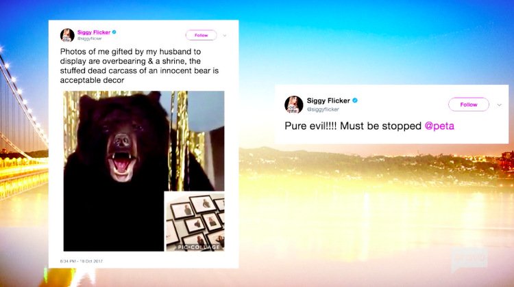 But it’s the next topic that’s really where the tea is piping hot: SIGGY’S BEHAVIOR ON SOCIAL MEDIA. Which, if you haven’t been following, is a portrait of a woman come undone. For REALZ. Margaret claims she has received death threats from some of the trolls trolling her, all in the name of Siggy Flicker Fandom. She calls out Siggy on tweeting at PETA over the stuffed bear in her foyer, which Siggy initially denies until the tweet is literally presented on screen!