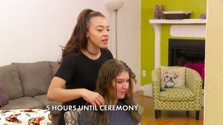 It’s wedding day. So Johnna is getting her hair did by Dolly, who’s making every attempt at cheering up the doomed bride. Johnna can’t believe she’s getting married in five hours to a guy she pressured into engagement straight outta prison. How’d that happen? Hmm.
