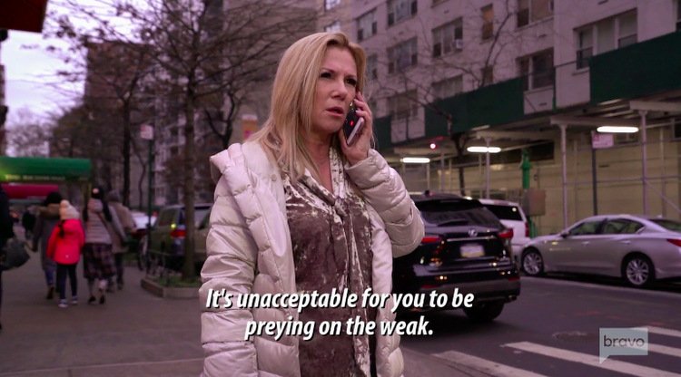 Thus it is that we finally arrive on the street with Ramona and her dog, who will star in the Lifetime movie which will come to be known one day as Ramona Finds Her Words. Bethenny calls to accuse Ramona of getting off on this fight she and Carole are having, which Ramona denies (but c’mon…she does enjoy it a little bit, right?). But it’s when Beth then accuses her of not supporting women that the Ramonacoaster goes COMPLETELY off the rails. And I’m not gonna lie, it’s weirdly awesome.