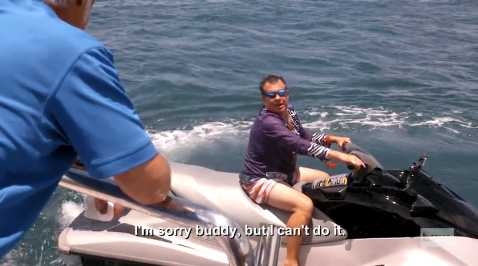 When Captain Lee gets wind of Steve’s reckless behavior he demands the fool get off the jet ski and he blames Chandler for dropping the ball. Except nobody makes Steve wear a lifejacket. He is his own man! Performing his own death-defying circus acts in a clown costume. Yay?