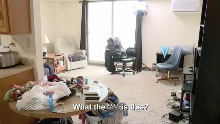 To fully understand this gruesome scene, let’s review the procession of reveals, as experienced in the actual horror movie. Ladies and gentlemen, I give you Eric’s apartment, a nightmare in five frames: