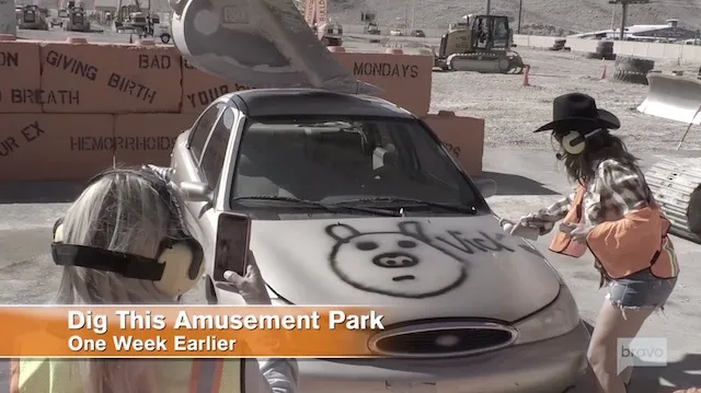 What happens in Vegas certainly doesn’t stay in Vegas. And smile and nod doesn’t go nearly as far as two-fingered flip-off! Tamra asks Emily about Vegas, which we know was only fishing (the main course in all of Shannon’s TV dinners!). Kelly shares that after Emily’s performance they went to one of those destruction parks. To help channel her anger, Kelly spray painted a picture of a pig on the hood of a beater car, wrote Vicki’s name on it, then pummeled it to death with a backhoe before frying it up and eating it with eggs for breakfast the following morning. You know, therapy! Kelly insists she actually thinks Vicki is pretty, but wanted to hurt her with the pig comment. Vicki’s just ugly on the inside!