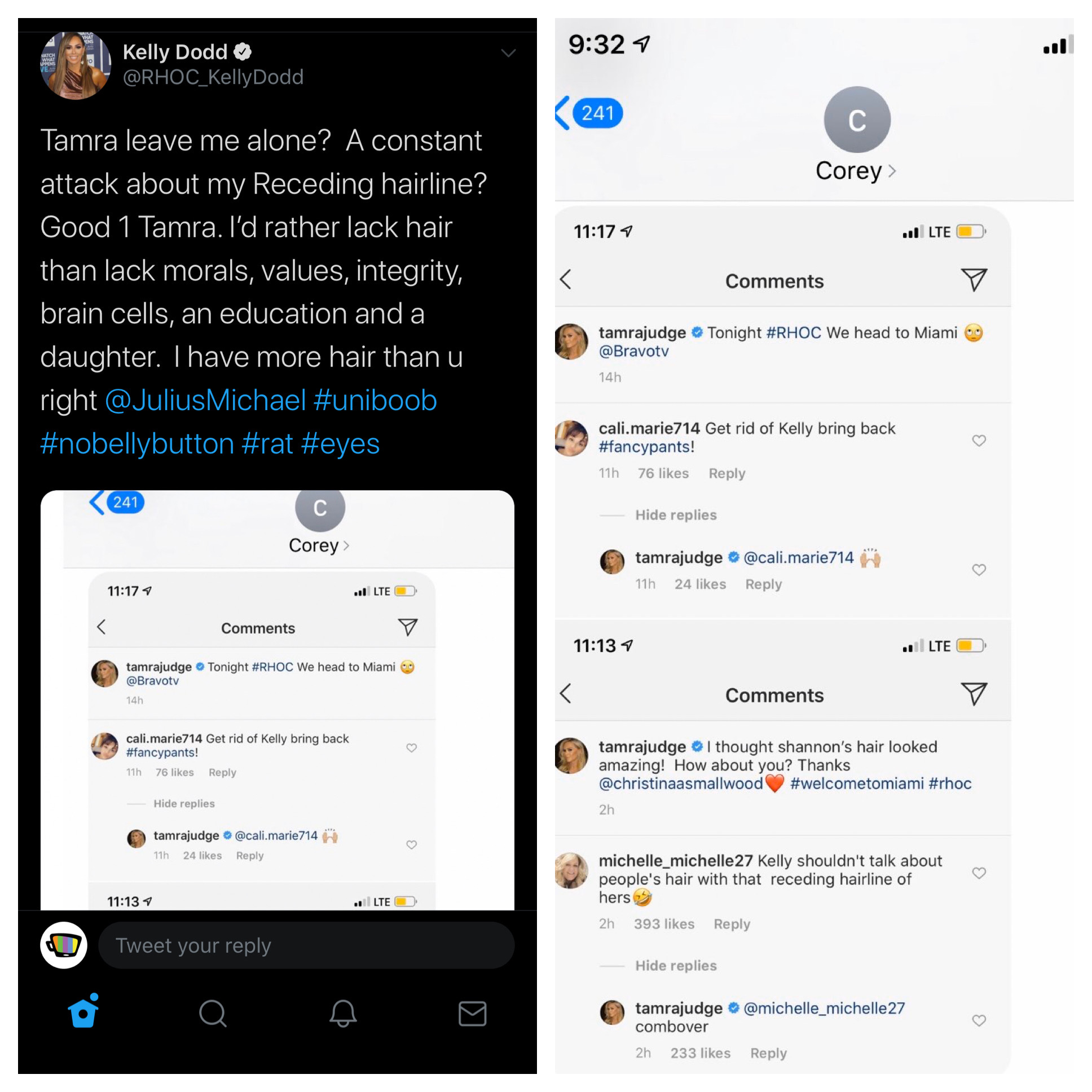 Along with those screenshots, Kelly wrote, “Tamra leave me alone? A constant attack about my Receding hairline? Good 1 Tamra. I’d rather lack hair than lack morals, values, integrity, brain cells, education, and a daughter. I have more hair than right @JuliusMichael #uniboob #nobellybutton #rat #eyes.” Julius is the hairstylist who works with most of the Bravolebrities when they are on Watch What Happens Live.