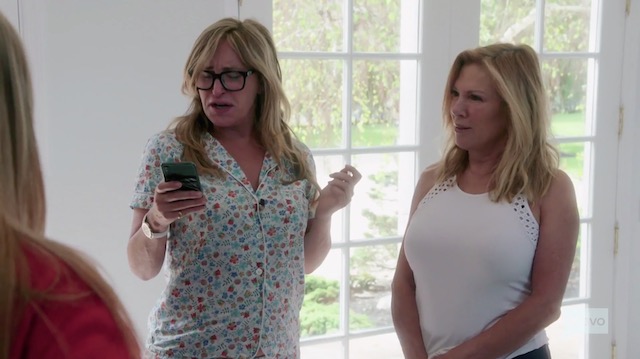 Sonja is also affronted by Luann’s arrogance. Waking up from her drunken slumber, like the giant who smelled fresh blood, Sonja is wearing old lady jammies, all twisted around, and her face is literally collapsed. She puts on enormous glasses and reads Luann’s text aloud in a theatrical voice. Then demands to see this basement. Another mansion, another house tour — except this one doesn’t have a bowling alley!