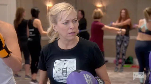 I’m not sure I understand the point of this retreat. The only exercise was a boxing class at 10am, but everything else was pure leisure. Lunch, followed by free time (aka the spa and the bar), meditation, closing with dinner. I thought this was a diet program? Despite the lax schedule it’s still a arduous struggle for Dorit Kemsley to participate.