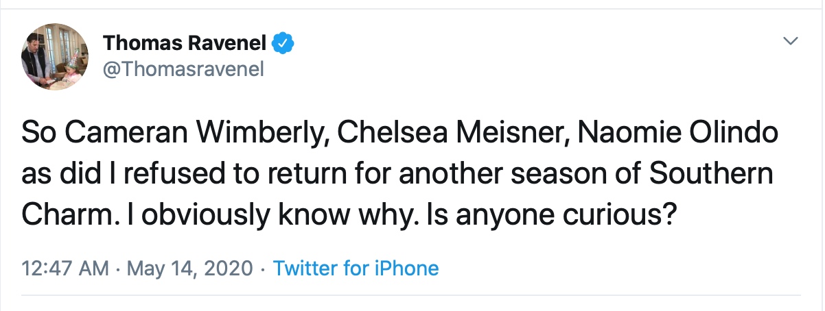 I won’t necessarily miss Thomas. I’m hoping this means there will officially be no more Ashley Jacobs appearances on my television screen. But according to Thomas, a number of other cast members refused to return to the show. In another since-deleted tweet, he writes: “So Cameran Wimberly, Chelsea Meissner, Naomie Olindo as did I refused to return for another season of Southern Charm. I obviously know why. Is anyone curious?” He is forgetting the part where he wasn’t asked back last season because of his sexual assault trial. Why would they want him back after that?