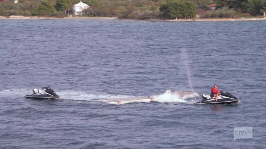 Malia decides to reward David Pascoe for all his hard work during the season by letting him go work the beach picnic with Katie. And almost as soon as he’s off the boat, disaster strikes and the anchor starts dragging. In fact, with Lady Michelle drifting into shallow waters, it’s such an emergency that Malia detaches the swim platform without even packing it away. Instead, Lloyd Spencer has to hop on a jet ski, attach all the water toys and fend for himself. Thankfully, the crew reacts quickly, and manages to haul anchor without, you know, wrecking the superyacht into the ocean floor. Crisis averted! Look at how far the deck team has come since the beginning of the season…
