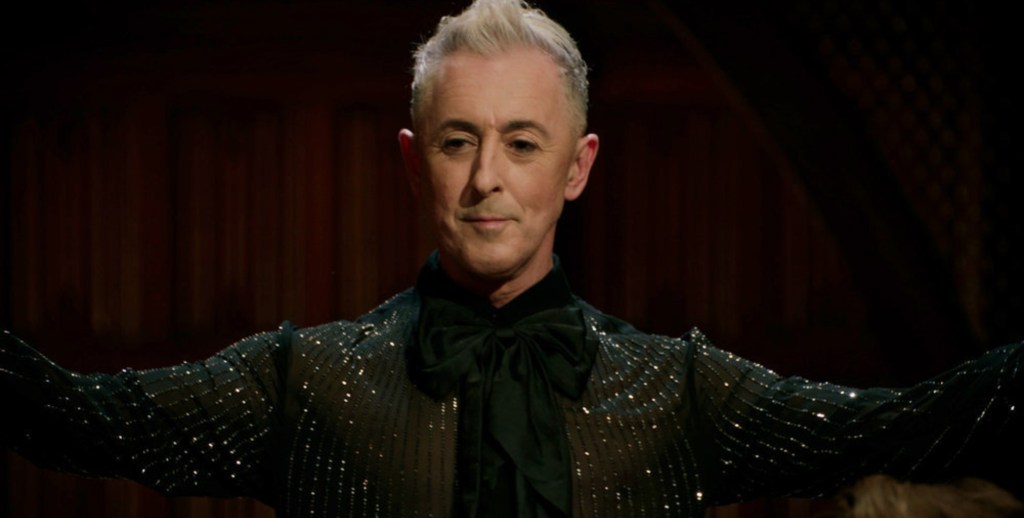 Perhaps my favorite look for Alan was the Red Era. The actor clearly had his color analysis done prior to Episode 1 because the outfit popped! Alan wore a red velvet suit with little gem accents all over. Naturally, he paired the suit with a black buttoned-down shirt, and the plaid cape just added to his elegance. We can all agree Edna Mode was wrong for saying, “No capes!” because this look just worked.