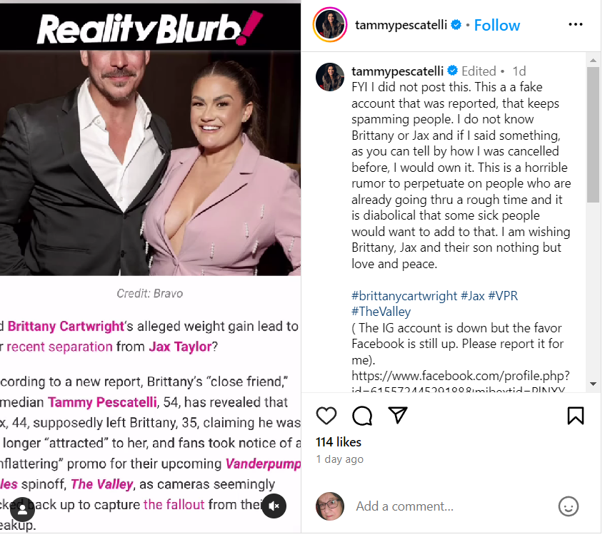 But Pescatelli has now stated that she never posted any such thing. “I do not know Brittany or Jax,” she said on her verified Instagram. “This is a horrible rumor to perpetuate on people who are already going thru a rough time.”