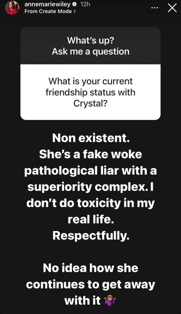 During a Q&A with fans on her Instagram Stories, Annemarie received the question: “What is your current friendship status with Crystal?” Annemarie answered, “Non existent. She’s a fake woke pathological liar with a superiority complex. I don’t do toxicity in my real life. Respectfully.” She wrote on, “No idea how she continues to get away with it,” along with a shrugging emoji. The response has now disappeared, but was posted to Reddit.
