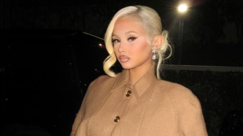 Alabama Barker wore a beige button-down dress featuring a prominent collar and short sleeves. She paired the outfit with black tights and matching platform heels. For accessories, Barker opted for diamond earrings, rings, bracelets, and a statement watch. The star completed the look with a full glam makeup look.