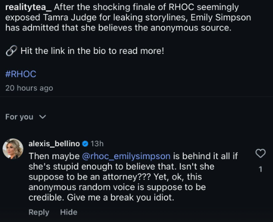 “Then maybe @rhoc_emilysimpson is behind it all if she’s stupid enough to believe that. Isn’t she suppose[d] to be an attorney??? Yet, ok, this anonymous random voice is suppose[d] to be credible. Give me a break you idiot.”