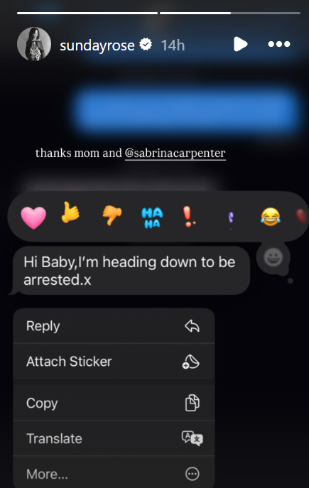 The cheeky moment didn’t just amuse concertgoers, but it also thrilled Kidman’s 17-year-old daughter, Sunday Rose, who shared her excitement on Instagram. The teen reposted a video of her mom’s onstage “arrest” with the caption, “Someone’s in trouble,” tagging Carpenter. She also shared a text exchange with her mom where Kidman wrote, “Hi baby, I’m heading down to be arrested. x,” to which Sunday replied, “thanks mom and @sabrinacarpenter.”