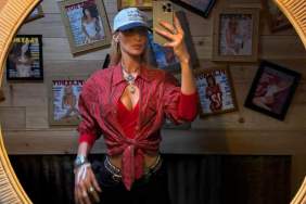 Bella posed topless and showed her back. She edited the picture by drawing white angel wings on her back. In other shots, she wore a sheer bralette with the mini skirt. The top has fine lace detailing. She also added a statement necklace with it. Her hair is worn in choppy curtain bangs with a warm blonde tone.