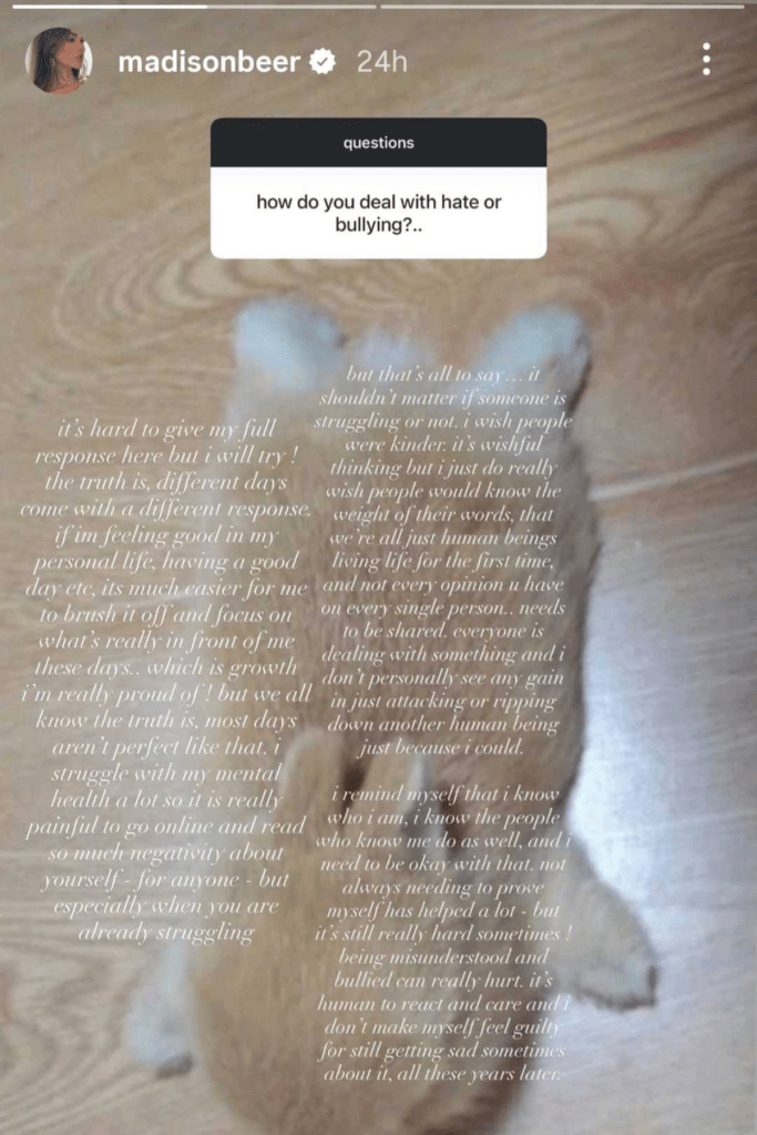 A fan recently asked Madison Beer how she deals with “hate & bullying” on Instagram. The singer decided to open up about the topic and shared her response to that question in one of her Stories. The artist began by penning, “It’s hard to give my full response here but I will try!” She continued, “The truth is, different days come with a different response.”