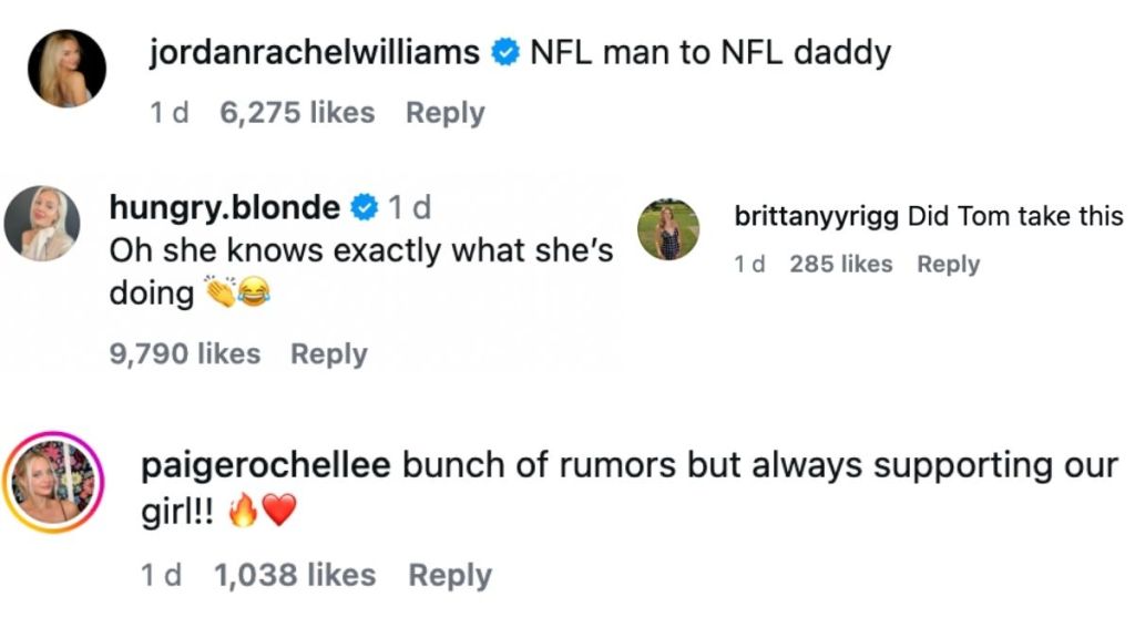 Fans quickly rushed to the comments section and flooded the post with reactions hinting at her alleged dating rumors with Tom Brady. Jordan Rachel, the actor, wrote, “NFL man to NFL daddy.” A fan wrote, “Bunch of rumors but always supporting our girl!!” A third viewer asked if Tom took the photos. Some commenters teased with some GIFs of Brady.