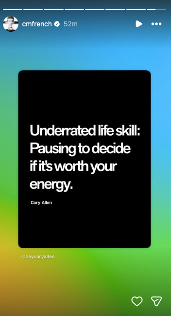 On Wednesday, he seemingly doubled down on the message, posting another story that read: “Underrated life skill: pausing to decide if it’s worth your energy.”