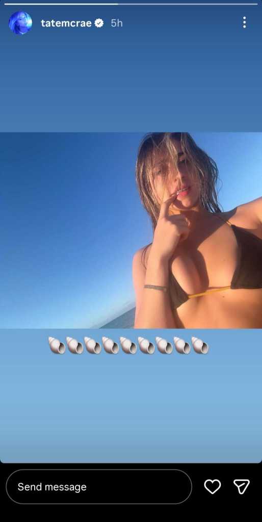 Tate McRae opens an Instagram story with relaxed vacation energy, letting the sun do most of the work. The story shows the Canadian popstar seaside, wearing a bikini. In the close selfie, McRae angles the camera low, exposing a black bra-style top. A row of shell emojis overlays the image, with no added caption text.