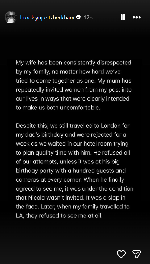 Brooklyn Peltz Beckham has publicly addressed speculation about a family rift in a series of Instagram posts to his 16 million followers, stating, “I do not want to reconcile with my family.” He accused his parents, Sir David and Lady Victoria Beckham, of “attacking” him and his wife, Nicola Peltz Beckham, through the media. He claimed they placed “lies” in the press to “preserve their own facade.” Brooklyn said he had stayed silent for years but was left with “no choice but to speak for myself and tell the truth.”