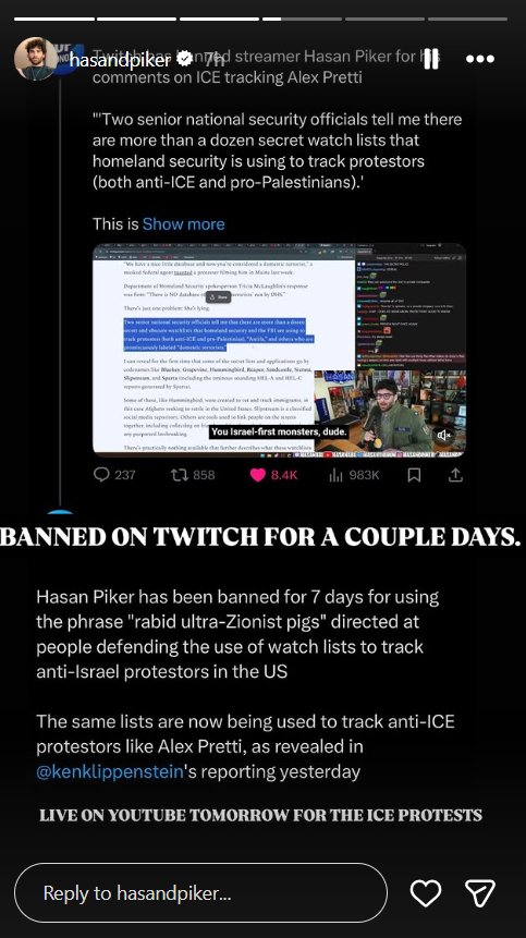 During the Twitch stream, Hasan speculated that ICE had been tracking Alex Pretti prior to his killing. “Two senior national security officials tell me there are more than a dozen secret watch lists that Homeland Security is using to track protestors, both anti-ICE and pro-Palestinians,” Hasan said.