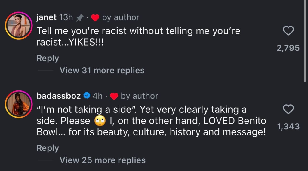 “’I’m not taking a side.’ Yet very clearly taking a side. Please,” Boz wrote with an eye-roll emoji. “I, on the other hand, LOVED Benito Bowl… for its beauty, culture, history, and message!”