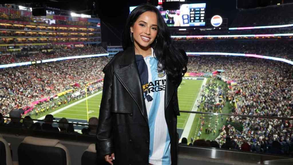 Becky G attended the Super Bowl in an outfit that was a perfect blend of sporty and stylish. She wore a light blue and white striped soccer jersey that appeared to be an Argentina national team shirt.