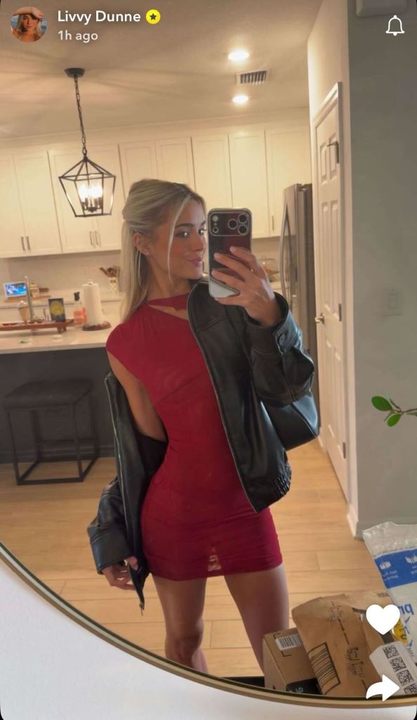 Livvy Dunne wears a sheer dress, and the Snapchat photo keeps the feed in holiday mode. The see-through red dress snap also reads like a Valentine’s Day post. The timing and styling match the seasonal theme, with the influencer leaning into red-on-red glamour for the camera.
