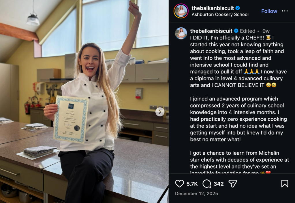 Regardless, on Instagram, Ellie recently revealed, “I DID IT, I’m officially a CHEF!!!” In her image, we see Ellie sitting on a countertop, wearing a chef’s uniform, happily displaying her graduation “diploma in level 4 advanced culinary arts.”