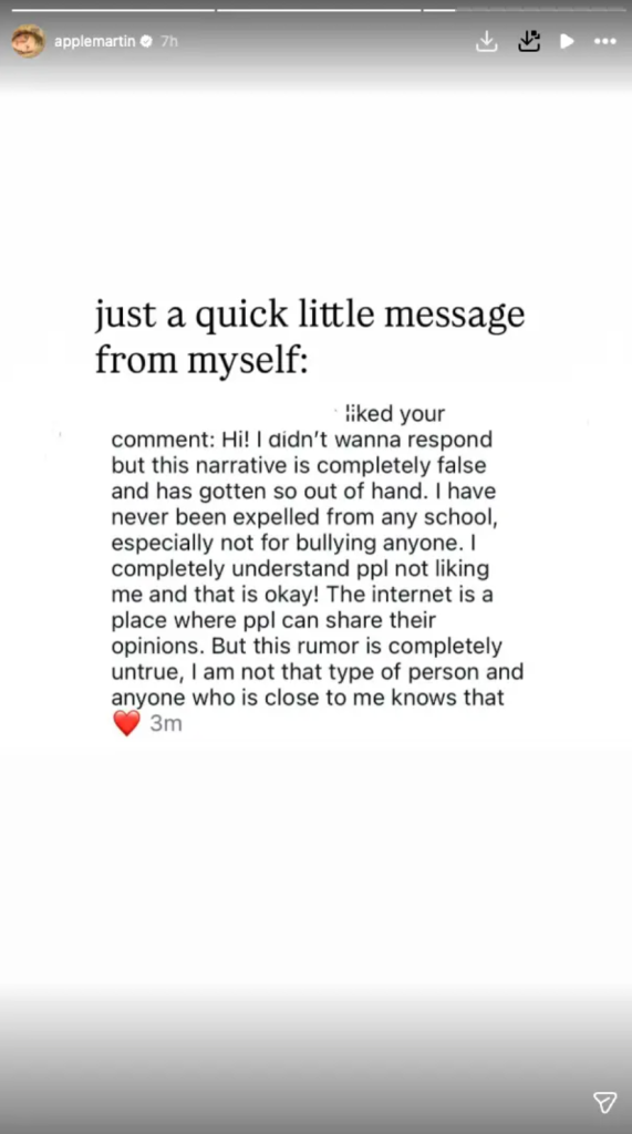 Apple Martin has broken her silence on rumors that she was expelled from school for bullying. The daughter of Gwyneth Paltrow and Chris Martin had been hit with accusations on social media about poor behavior in relation to her peers. But now she has shut down the claim, calling the narrative “false.”