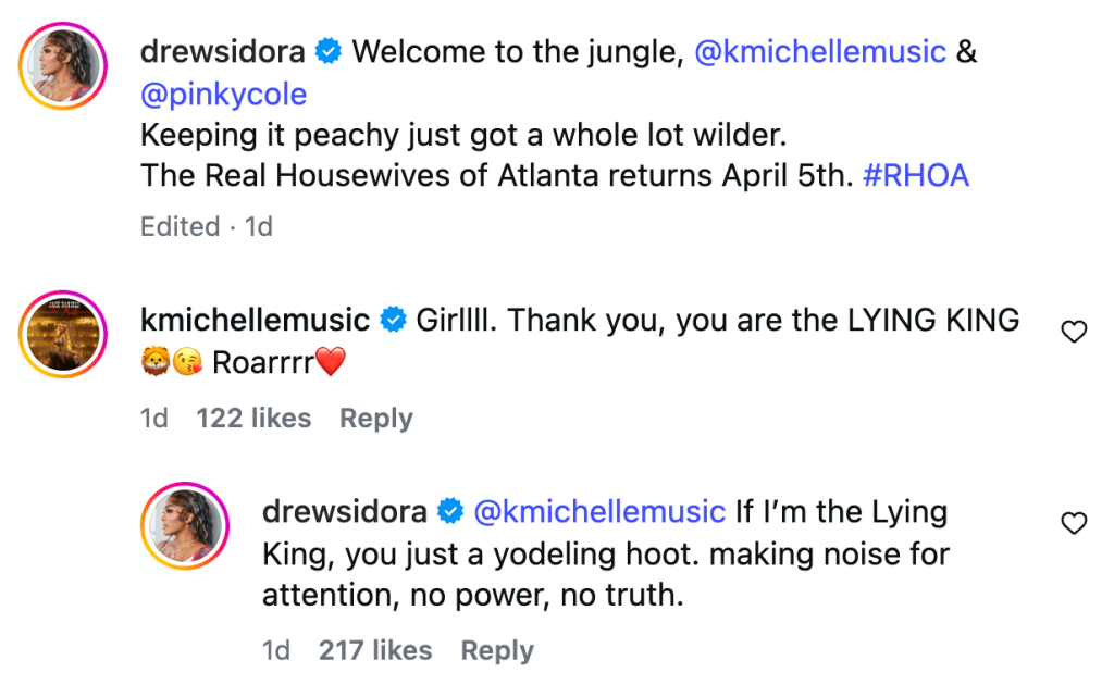 K. Michelle commented on her post. She wrote, “Girllll. Thank you, you are the LYING KING?? Roarrrr ❤️” Wow. That was blunt. Whether this comment was made in jest or not, Drew was not going to let that slide.