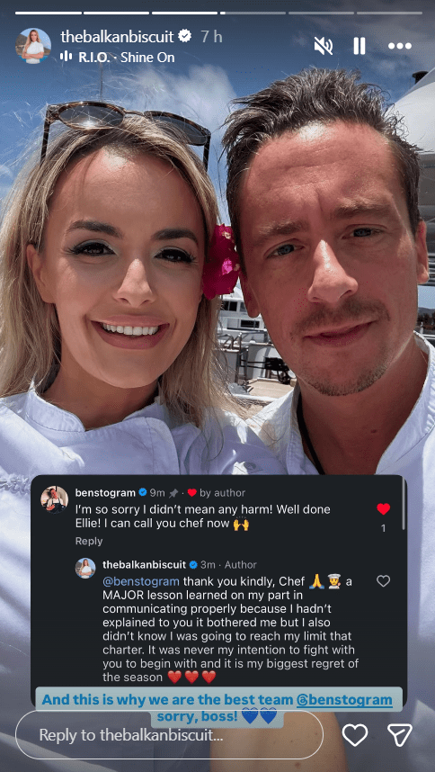 In response, an equally humble Ellie wrote, Thank you kindly, Chef. [This was] a MAJOR lesson learned on my part in communicating properly because I hadn’t explained to you [how] it bothered me, but I also didn’t know I was going to reach my limit that charter. It was never my intention to fight with you to begin with, and it is my biggest regret of the season.”