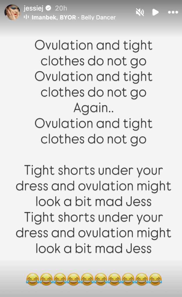 Then she got even more specific about what had gone wrong. The “Bang Bang” hitmaker wrote twice, “Tight shorts under your dress and ovulation might look a bit mad Jess.” For context, here, “mad” meant a bit ridiculous, off, or over-the-top in a playful British sense. So “mad Jess” meant her outfit looked slightly wrong or chaotic. She also added a lot of smiling emojis at the end of the post. For many women, ovulation time can bring bloating, swelling, cramps, tenderness, and a heavy, puffy feeling.