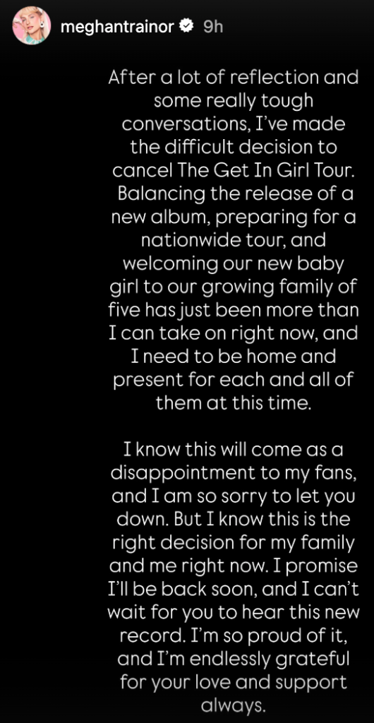 The “All About That Bass” hitmaker continued, “Balancing the release of a new album, preparing for a nationwide tour and welcoming our new baby girl to our growing family of five has just been more than I can take on right now and I need to be home and present for each and all of them at this time.”