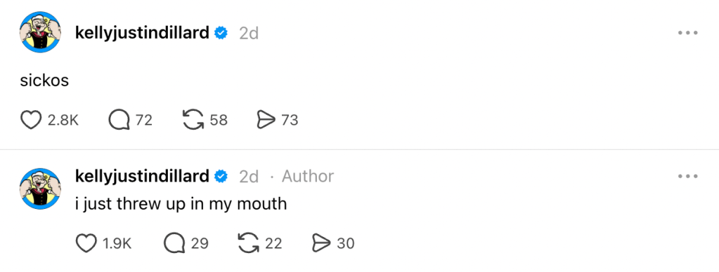 Fellow Summer House star, KJ Dillard, was not thrilled seeing them sucking face at the game. He took to Threads and wrote, “Sickos.” He followed this up with “I just threw up in my mouth” and then “Thank god Kansas City claims me,” referring to his hometown.