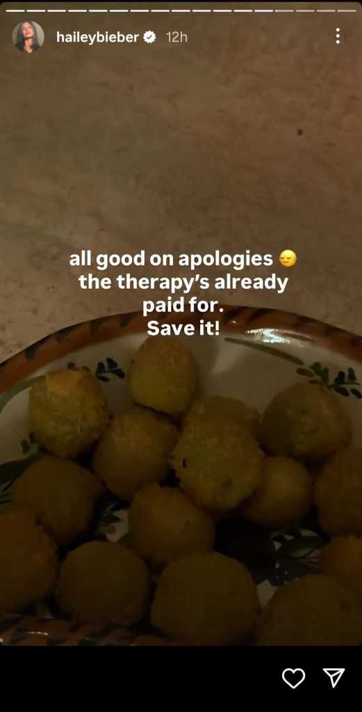 Hailey Bieber says ‘therapy’s already paid for’ in cryptic ‘apologies’ post on Instagram story.
