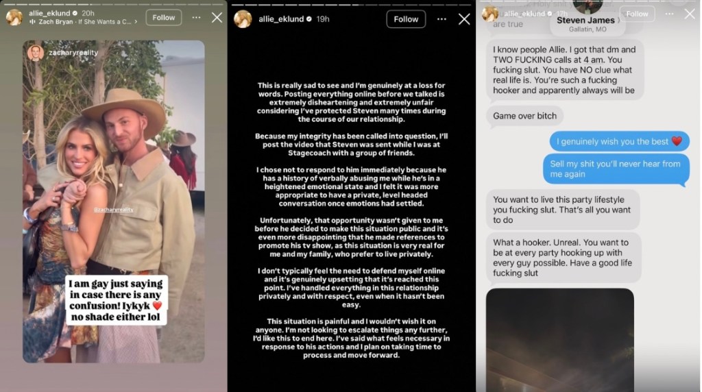 It looks like Allie is done keeping things private, but to be fair, it was Steven who opened the social media door. Along with her statement, she shared several moments from Stagecoach, including hanging out with her friends and screenshots of Steven ranting at her and telling her to get her things and get out.