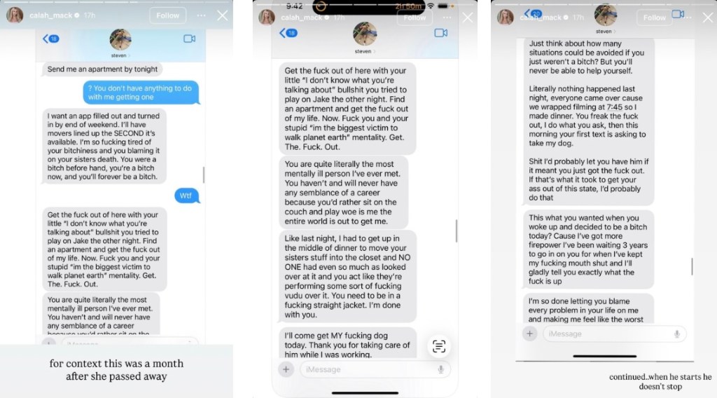 She then shared screenshots of her own of conversations she had with Steven about her sister’s passing. She had asked him to move her sister’s urn and photo, and it spiraled. This is just a snapshot of the whole conversation, but in the messages, Steven calls her a “b*tch” and mentally unwell.