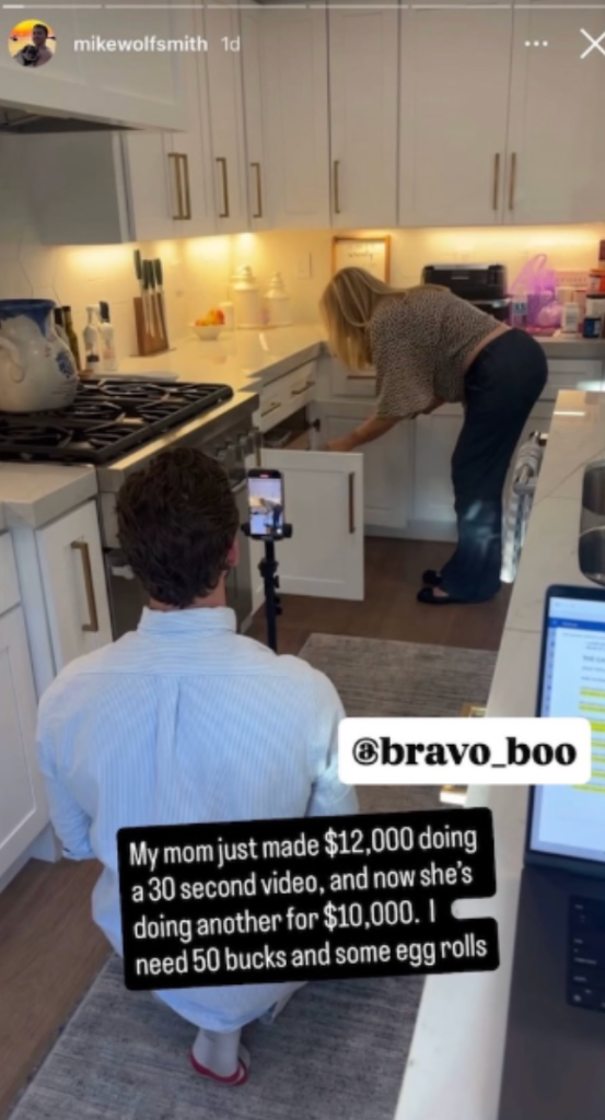 “My mom just made $12,000 doing a 30-second video,” he said in his Story, which was later reshared by several Bravo fan accounts. “And now she’s doing another for $10,000.”